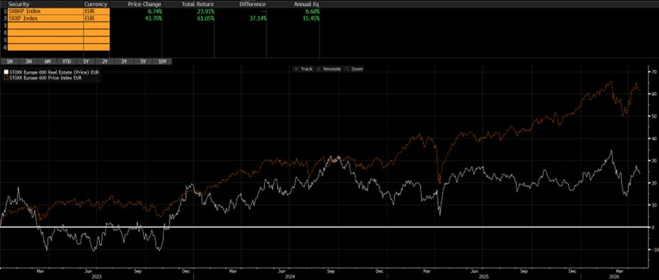 Az európai ingatlanindex 2023 óta lényegében oldalaz, ezzel szemben azért a széles európai piacot tömörítő STOXX 600 index jóval kedvezőbb hozamot tudott produkálni.