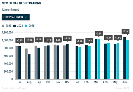 Ezen kifejezetten negatív várakozások fő oka a gyengülő kereslet az új gépjárművekben Európában. Az új autó forgalomba helyezések 1,9%-kal csökkentek 2024 H1-hez képest, júniusban pedig az éves csökkenés drasztikus 7,3%.
